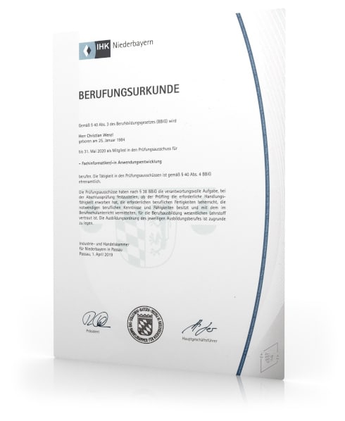 Zum 01. April 2019 wurde unser Geschäftsführer Christian Wenzl in den Prüfungsausschuss der IHK Niederbayern aufgenommen und unterstützt somit u.a. die Abnahme der Abschlussprüfungen.