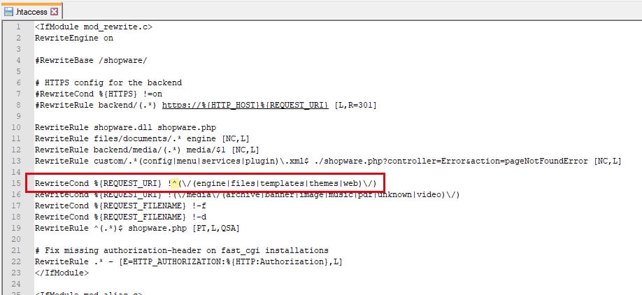 Ursache sind die Umleitungen innerhalb der htaccess von Shopware. Eine Lösung ist, die Systemordner so auszuschließen, dass die Umleitungsregel nur dann greift, wenn die reservierten Systemordner direkt am Anfang der URL stehen, siehe Screenshot.